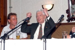 Met verdriet hebben wij vernomen dat oud-president Dries van Agt is overleden. Als Brabander had hij van jongs af aan een passie voor het wielrennen. Van Agt was vele jaren lid van het comité van aanbeveling van de Vrienden van de Acht van Chaam. Als jonge jongen bezocht Van Agt al de Acht van Chaam. In 1977, toen hij demissionair minister was in het legendarische kabinet Den Uyl, volgde hij de wedstrijden in Chaam vanaf de eretribune. Ook in 1983 was hij te gast tijdens de Acht als Commissaris van de Koningin. Op 29 mei 2008 sprak Van Agt tijdens een sponsorbijeenkomst van de Acht van Chaam in Het Chaamsche Wapen. In 2013 schreef Van Agt het voorwoord voor het boek “75 x Acht van Chaam”, waarin hij de Acht bestempelde als het ‘pronkjuweel van de wielergeschiedenis van Nederland’.